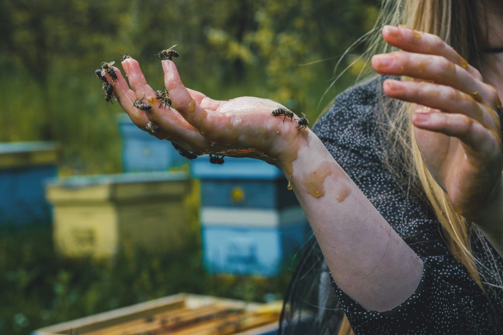 As it comes to the photo shoot and the shooting process in general – it was again a brand new experience and a whole adventure for our team, in front and behind the lens. It took full silence and peace of mind and body to enter the world of bees. The lack of any perfume or fragrance was a strict condition – not only for the success of the shoot, but also for our own safety. That way, we had the opportunity to literally touch these little creatures and feel them on our skin. A feeling that could not be described with words, but should be felt.
